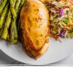Once cooked, you can drain any juices from the tray and quickly baste the chicken breasts again with those flavorful drippings to enhance the glossy finish. Let the chicken rest for about 5 minutes before slicing – this lets the juices redistribute, keeping every bite tender and juicy.