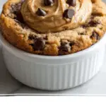 A white round ramekin holds a baked chocolate chip cookie with a light golden-brown top and visible melted chocolate chips all over. On top of the cookie, there is a thick, smooth swirl of peanut butter cream, medium brown in color, partially covering the cookie with some areas left exposed. Additional shiny chocolate chips are scattered on top of the peanut butter layer. The ramekin sits on a white marbled surface with a small chocolate chip nearby. Another ramekin with a baked cookie and peanut butter cream is partially visible in the top right corner. photo taken with an iphone --ar 4:5 --v 7