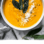 Serve the soup steaming hot with a generous sprinkle of freshly grated Parmesan and the crispy sage leaves right on top. These garnishes add visual appeal and layers of flavor — the saltiness of the cheese balances the sweetness of the squash, while the crispy sage adds a satisfying crunch and a perfume of earthy spice that makes every spoonful a little celebration.