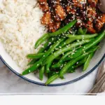 This Healthy Sesame Chicken recipe features tender chicken breast cubes sautéed and coated in a flavorful sauce made with coconut aminos, honey, toasted sesame oil, garlic, ginger, and lime. Served over white rice and green beans, it’s a balanced and delicious meal that brings together savory, tangy, and slightly sweet flavors in under 40 minutes.