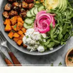 These Hot Honey Chicken Bowls feature perfectly roasted sweet potatoes, tender pan-cooked chicken coated in a spicy and sweet hot honey marinade, fresh arugula, creamy cottage cheese, and vibrant vegetables. Topped with pickled red onions, avocado slices, and optional corn salsa, these bowls offer a delightful balance of flavors and textures ideal for a wholesome and satisfying meal.