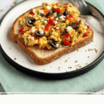 A vibrant and flavorful Mediterranean Scrambled Eggs recipe featuring fresh vegetables, tangy feta cheese, and aromatic herbs. Perfect for a nutritious and delicious breakfast or brunch, this dish combines the creaminess of eggs with the salty punch of olives and capers, enhanced with a touch of oregano and fresh parsley. Served optionally with buttered toast and crunchy pumpkin seeds for texture.