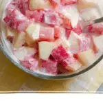 A small white square bowl on a yellow striped cloth holds a salad made of three main layers: light pink pieces, white cubes, and some yellow chunks, all mixed together and covered with a creamy sauce giving a slightly shiny look. The bowl is filled up close to the top with no extra space around the salad. The background shows part of a larger white bowl with a dark rim, blurred out. The whole scene is on a white marbled surface. photo taken with an iphone --ar 4:5 --v 7