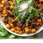 - Serve: Plate the creamy roasted red pepper chicken pasta and top with additional fresh grated manchego cheese and a handful of fresh arugula to add a peppery freshness. Serve immediately and enjoy this hearty and vibrant one-pot meal.
