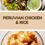 This flavorful Peruvian Chicken and Rice recipe features marinated chicken grilled or baked to juicy perfection, served alongside fragrant turmeric-infused jasmine rice with peas, and topped with a creamy, zesty green cilantro jalapeño sauce. A vibrant and satisfying meal highlighting classic Peruvian flavors with simple steps, perfect for a family dinner or special occasion.