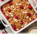 - Assemble in Baking Dish: Pour the oatmeal mixture into the prepared baking dish and spread it out evenly. Top with the remaining raspberries, sliced almonds, and sprinkle with turbinado sugar for a crispy, sweet crust.