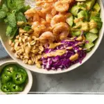 4. Assemble the salad: In a large serving bowl, combine cooked vermicelli noodles, shredded purple cabbage, chopped cucumbers, shredded carrots, chopped jalapeño, chopped avocado, green onions, cilantro, and mint. Add the pan-fried shrimp on top, then pour over the peanut dressing. Toss gently to combine all ingredients evenly.