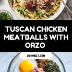 This Tuscan Chicken Meatballs and Orzo is a flavorful and easy one-pan meal perfect for the whole family. Featuring tender homemade chicken meatballs combined with sun-dried tomatoes, garlic, Italian herbs, Parmesan, spinach, and creamy orzo pasta, this dish blends hearty proteins with vibrant Mediterranean flavors for a satisfying dinner.
